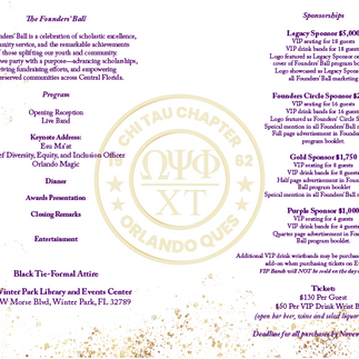 The Founders' Ball Is a celebration of scholastic excellence, community service, and the remarkable achievements of those uplifting our youth and community. Join us as we party with a purpose-advancing scholarships, driving fundraising efforts, and empowering underserved communities across Central Florida.